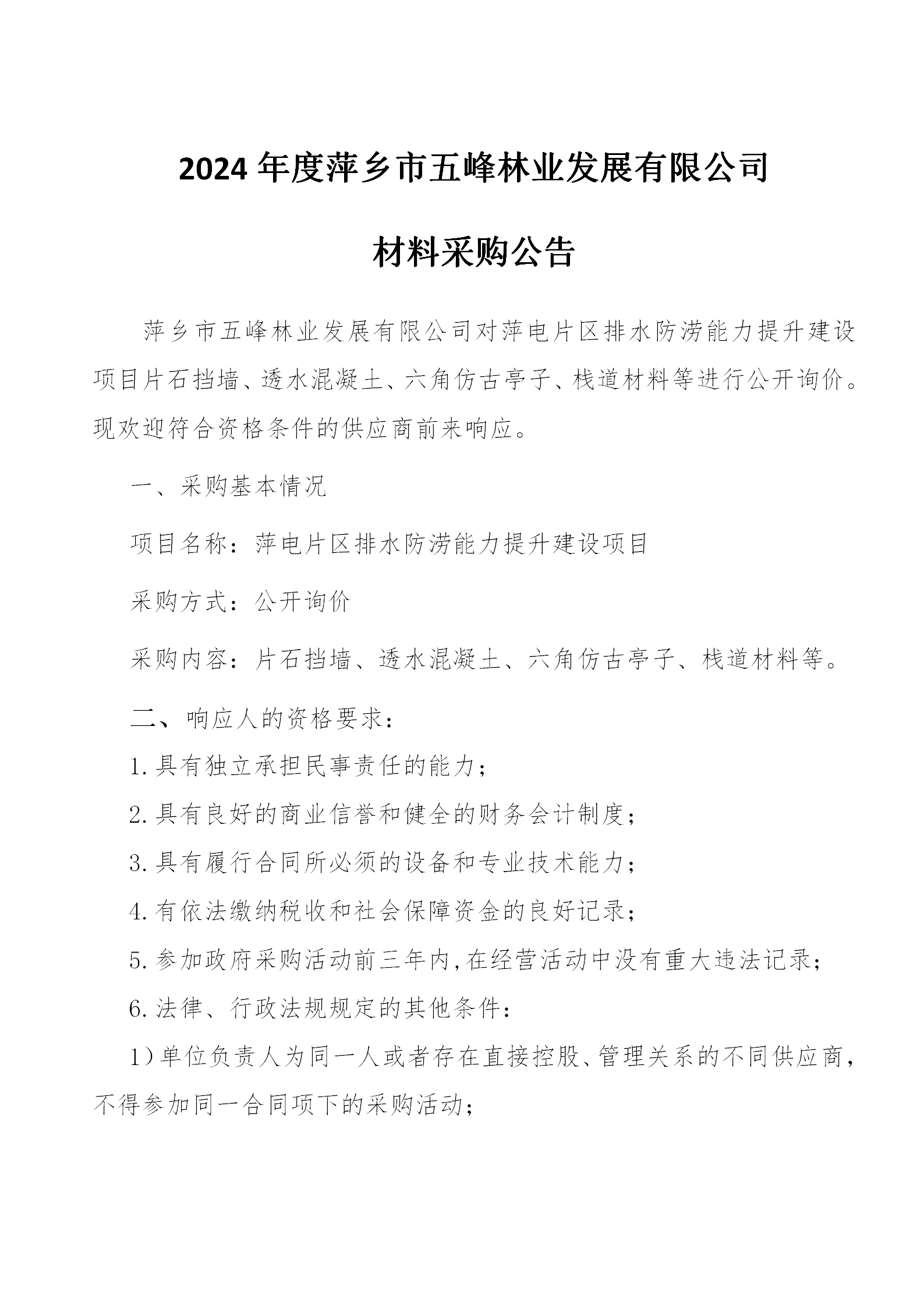 萍鄉(xiāng)市五峰林業(yè)發(fā)展有限公司現(xiàn)對“萍鄉(xiāng)市湘東區(qū)萍電片區(qū)排水防澇能力提升項目材料采購進(jìn)行公開詢價?,F(xiàn)歡迎符合資格條件的供應(yīng)商前來響應(yīng)。