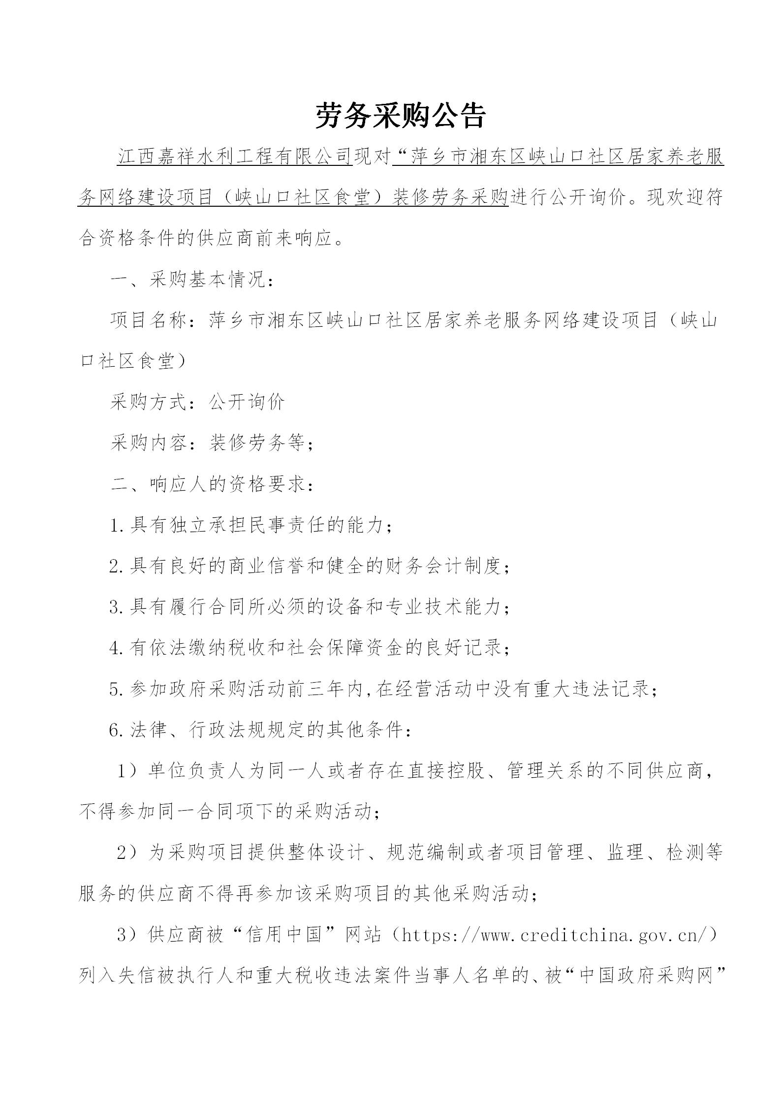 江西嘉祥水利工程有限公司現(xiàn)對“萍鄉(xiāng)市采煤沉陷區(qū)湘東區(qū)冬瓜槽區(qū)避險(xiǎn)搬遷項(xiàng)目進(jìn)行公開詢價(jià)?,F(xiàn)歡迎符合資格條件的供應(yīng)商前來響應(yīng)。