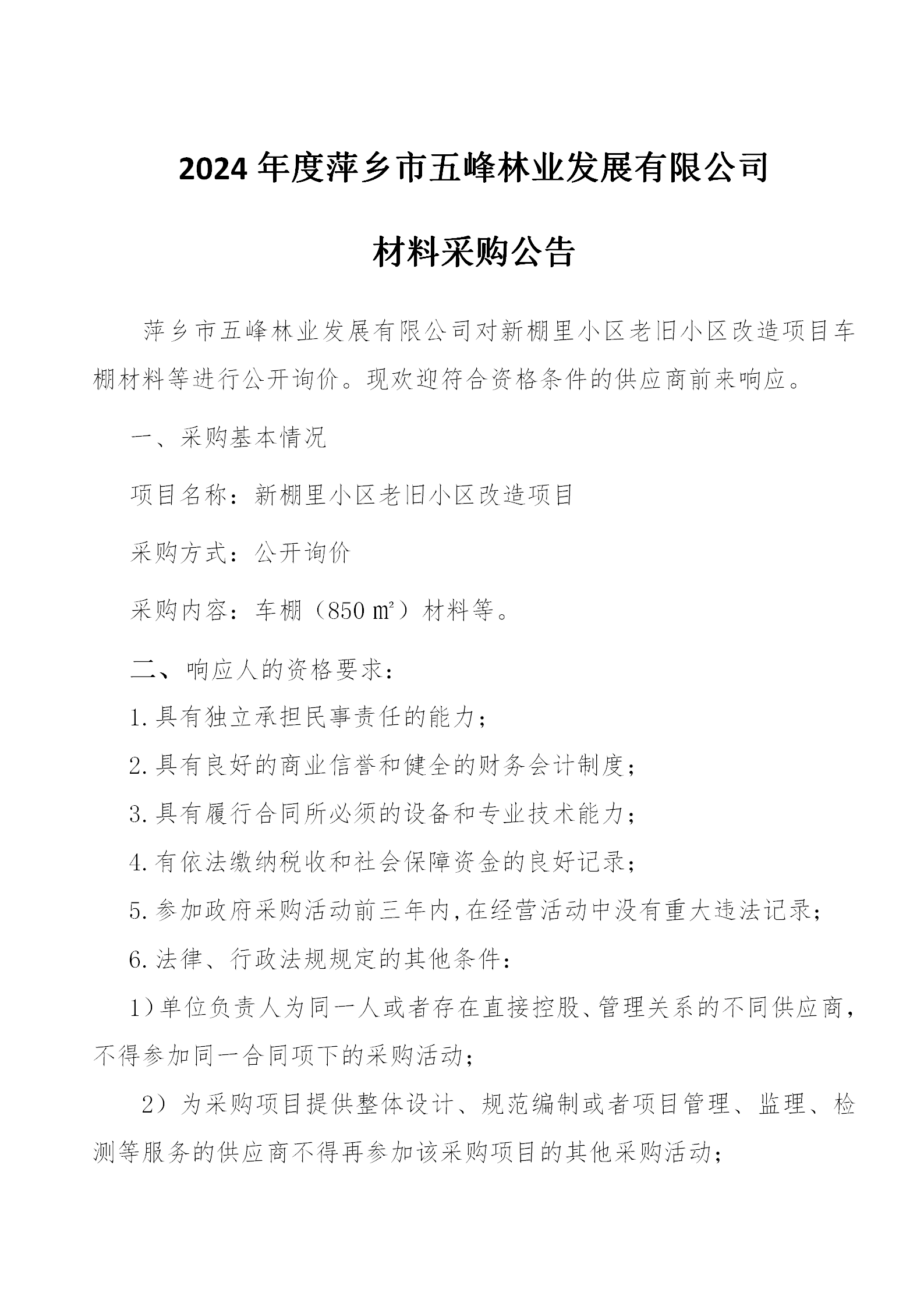 萍鄉(xiāng)市五峰林業(yè)發(fā)展有限公司現(xiàn)對(duì)“萍鄉(xiāng)市湘東區(qū)新棚里小區(qū)老舊小區(qū)改造項(xiàng)目材料采購進(jìn)行公開詢價(jià)?,F(xiàn)歡迎符合資格條件的供應(yīng)商前來響應(yīng)。