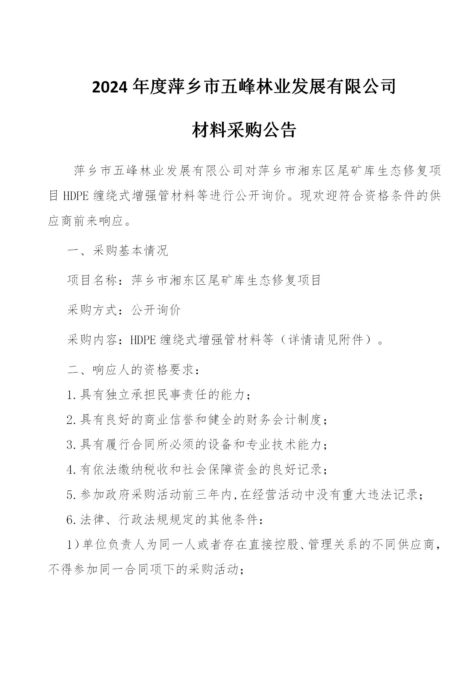 萍鄉(xiāng)市五峰林業(yè)發(fā)展有限公司現(xiàn)對“萍鄉(xiāng)市湘東區(qū)萍電片區(qū)排水防澇能力提升項(xiàng)目材料采購進(jìn)行公開詢價(jià)?,F(xiàn)歡迎符合資格條件的供應(yīng)商前來響應(yīng)。