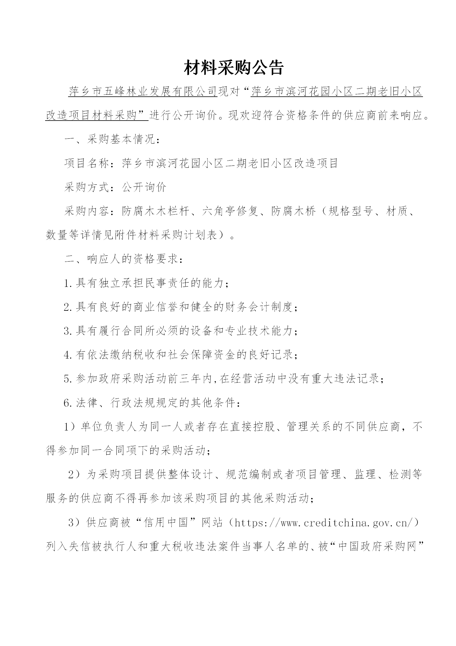 萍鄉(xiāng)市五峰林業(yè)發(fā)展有限公司現(xiàn)對(duì)“萍鄉(xiāng)市湘東區(qū)新棚里小區(qū)老舊小區(qū)改造項(xiàng)目材料采購進(jìn)行公開詢價(jià)。現(xiàn)歡迎符合資格條件的供應(yīng)商前來響應(yīng)。