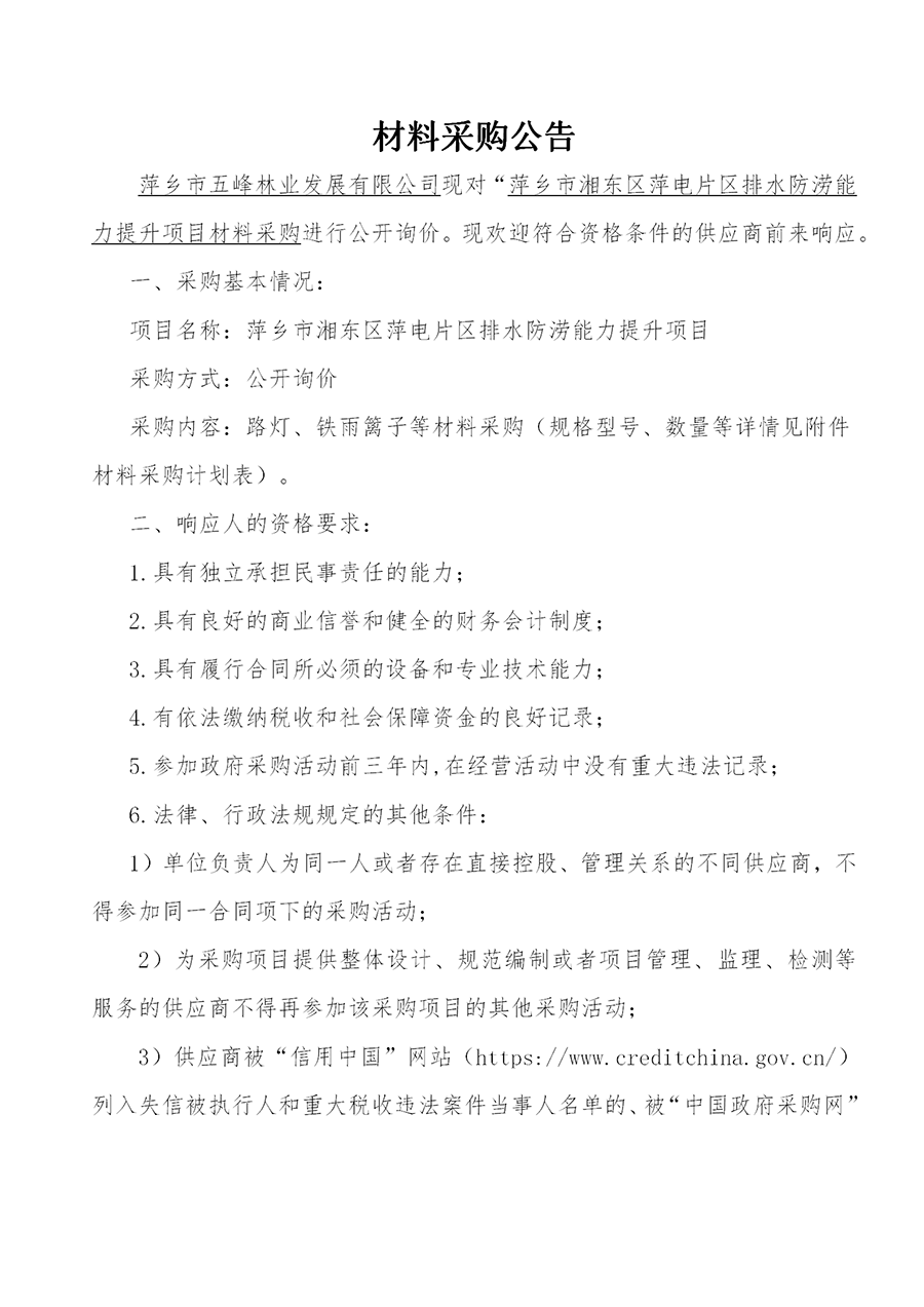 萍鄉(xiāng)市五峰林業(yè)發(fā)展有限公司現(xiàn)對(duì)“萍鄉(xiāng)市湘東區(qū)新棚里小區(qū)老舊小區(qū)改造項(xiàng)目材料采購(gòu)進(jìn)行公開詢價(jià)?,F(xiàn)歡迎符合資格條件的供應(yīng)商前來響應(yīng)。