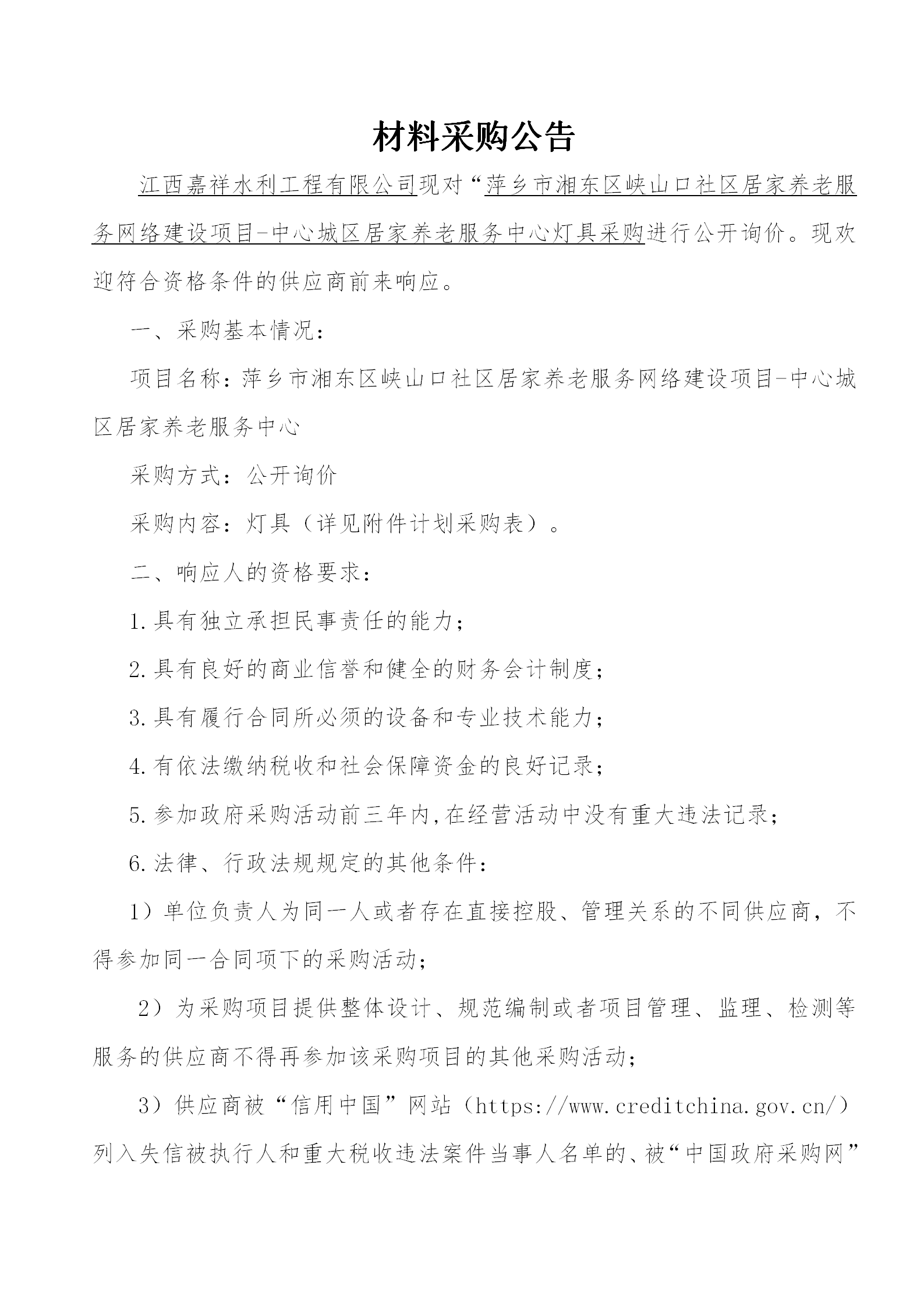 江西嘉祥水利工程有限公司現(xiàn)對(duì)“萍鄉(xiāng)市湘東區(qū)峽山口社區(qū)居家養(yǎng)老服務(wù)網(wǎng)絡(luò)建設(shè)項(xiàng)目-中心城區(qū)居家養(yǎng)老服務(wù)中心采購進(jìn)行公開詢價(jià)?,F(xiàn)歡迎符合資格條件的供應(yīng)商前來響應(yīng)。