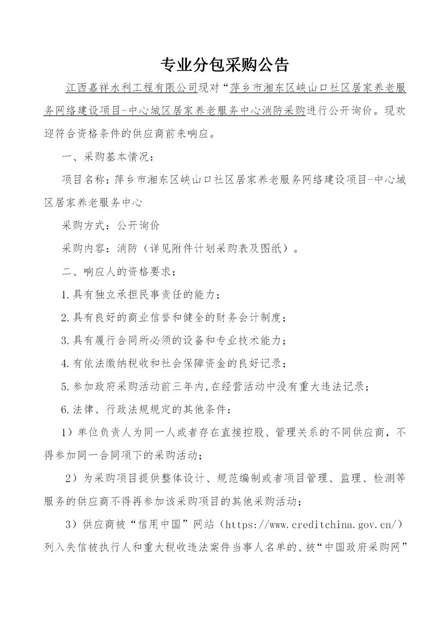 江西嘉祥水利工程有限公司現(xiàn)對“萍鄉(xiāng)市湘東區(qū)峽山口社區(qū)居家養(yǎng)老服務網(wǎng)絡(luò)建設(shè)項目-中心城區(qū)居家養(yǎng)老服務中心采購進行公開詢價。現(xiàn)歡迎符合資格條件的供應商前來響應。
