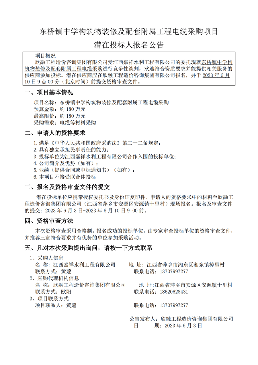 東橋鎮(zhèn)中學構(gòu)筑物裝修及配套附屬工程電纜采購項目 潛在投標人報名公告