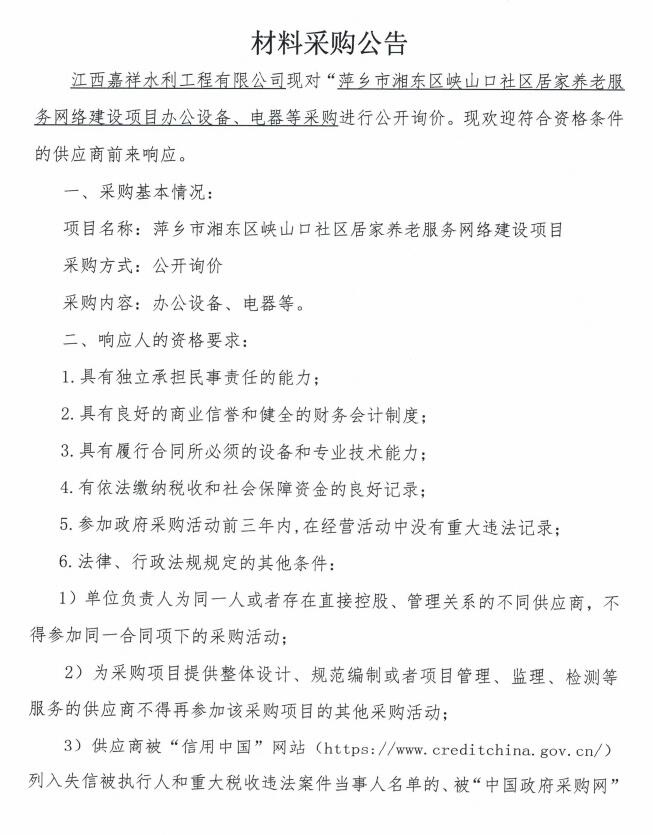 江西嘉祥水利工程有限公司現(xiàn)對“萍鄉(xiāng)市采煤沉陷區(qū)湘東區(qū)冬瓜槽區(qū)避險搬遷項目進行公開詢價?,F(xiàn)歡迎符合資格條件的供應(yīng)商前來響應(yīng)。