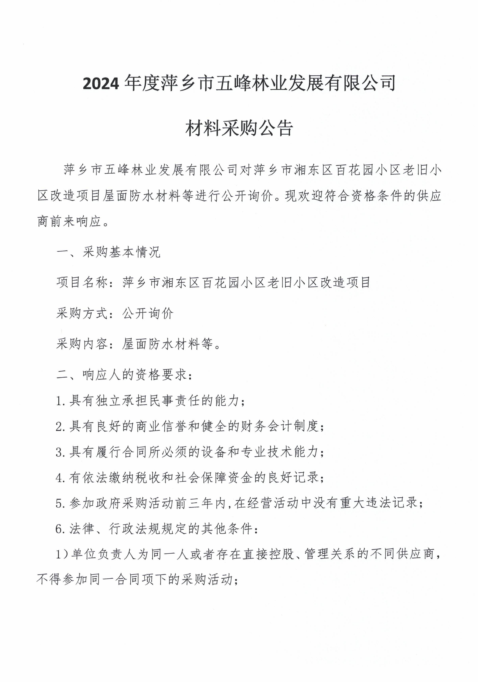 萍鄉(xiāng)市五峰林業(yè)發(fā)展有限公司現(xiàn)對“萍鄉(xiāng)市湘東區(qū)新棚里小區(qū)老舊小區(qū)改造項目材料采購進行公開詢價?,F(xiàn)歡迎符合資格條件的供應(yīng)商前來響應(yīng)。